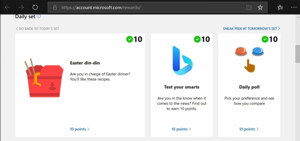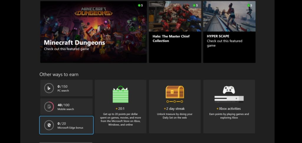 Finally, using the Bing platform to search can be a huge booster to your point-earning abilities. Every day there is the chance to earn hundreds of points just by using Bing as your search engine of choice. Using the Microsoft Edge browser, while logged into your Microsoft (Xbox linked) account can give up to 150 points per day. An additional 100 points are given by using the Bing app to search the web with mobile devices. Each of these methods accrues in 5 point increments until the cap is reached. This daily injection of points can really make a big difference in earnings.