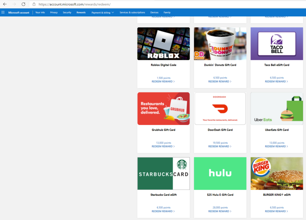 To be clear, this is not a paycheck or a means of income, but rewards points can be used for gift cards to be used on the Microsoft Store for your Xbox, and Windows 10. Even gift cards for other companies, like Starbucks or Door Dash.